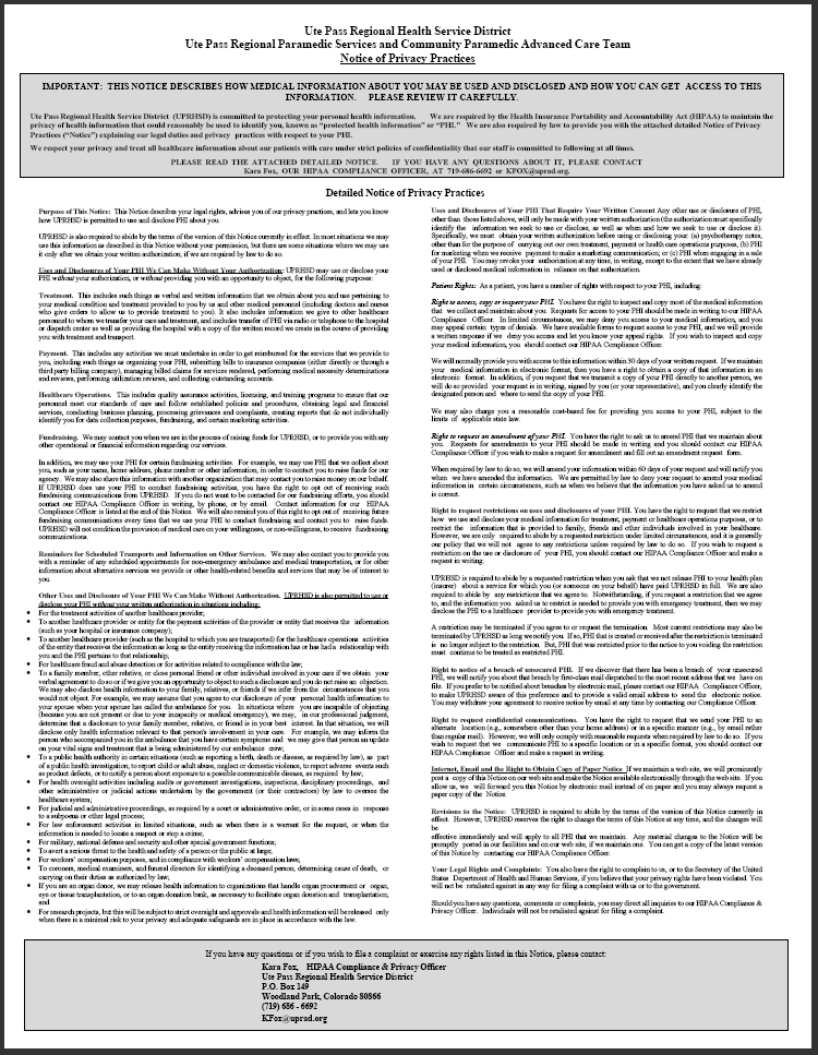 Patients may request a copy of their own medical and billing records by coming into the Administration Office with a valid photo ID and a completed Authorization for Disclosure of Protected Health Information. For more information contact Chief Administrative Officer Kara Fox at KFOX@uprad.org